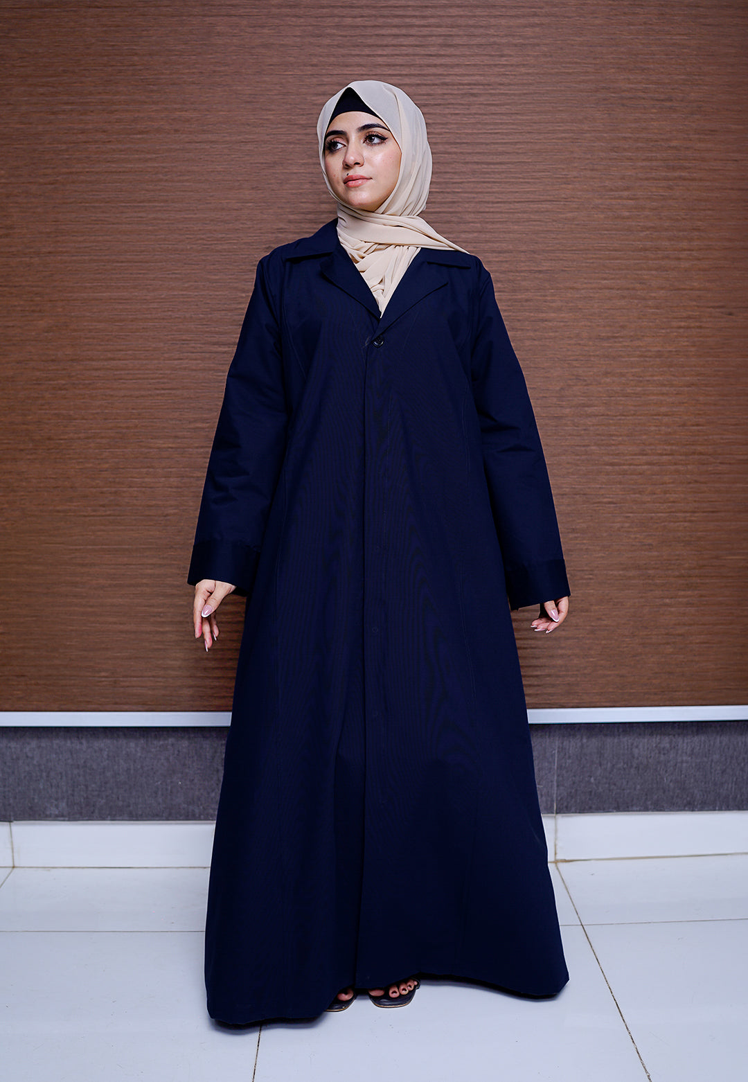 This Coat-Style Abaya features intricate tailoring that gives it a high-end, structured appearance from every angle.