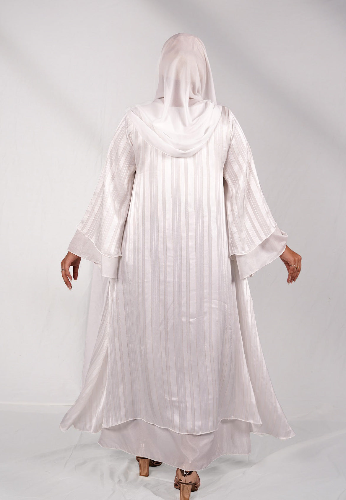Update your modest wear selection with our luxurious white abaya. Crafted with meticulous attention to detail, it has classic stripes with a luxurious touch. Perfect for Umrah!