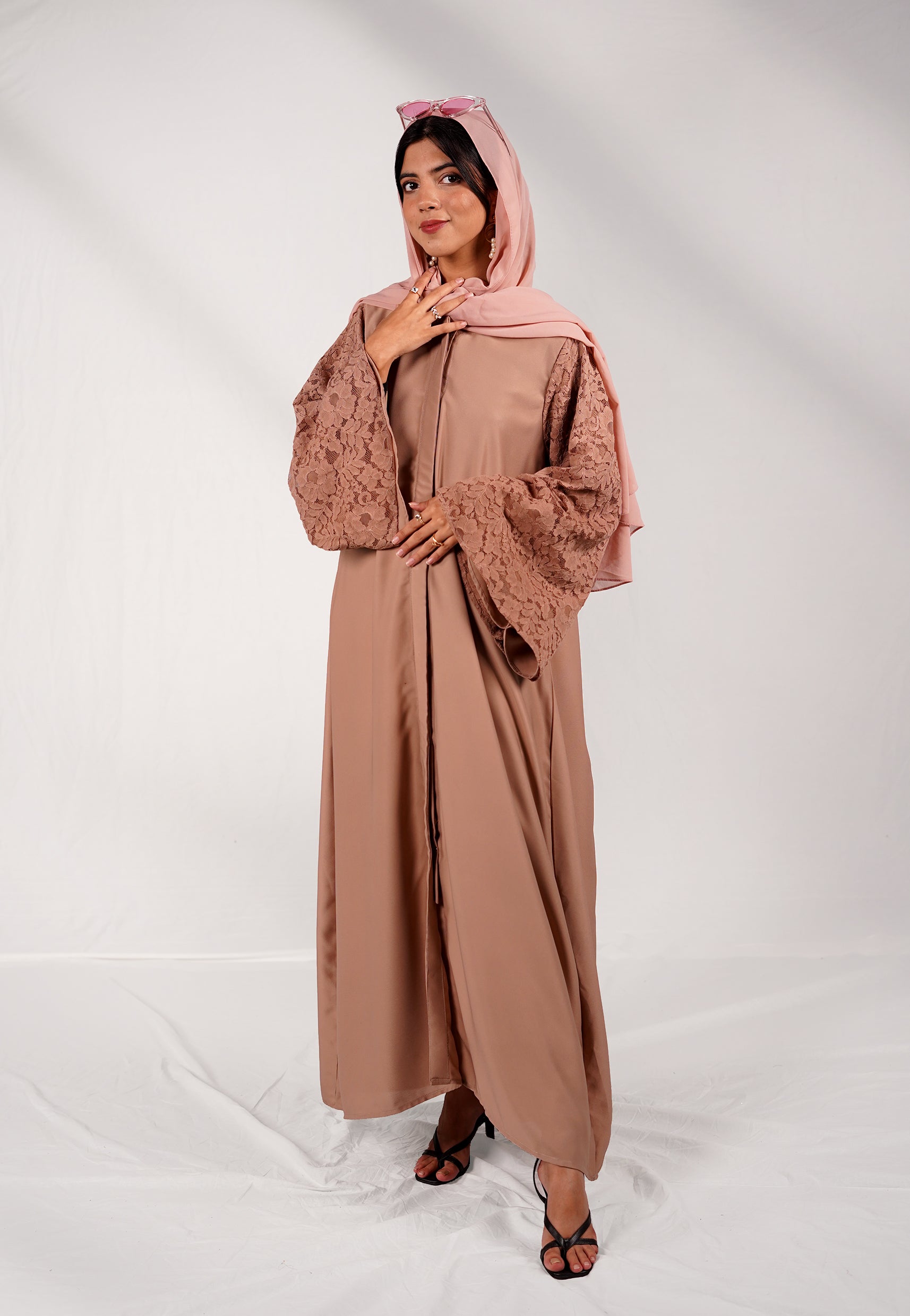 A classic modest abaya with floral net sleeves, perfect for everyday wear and school/university.