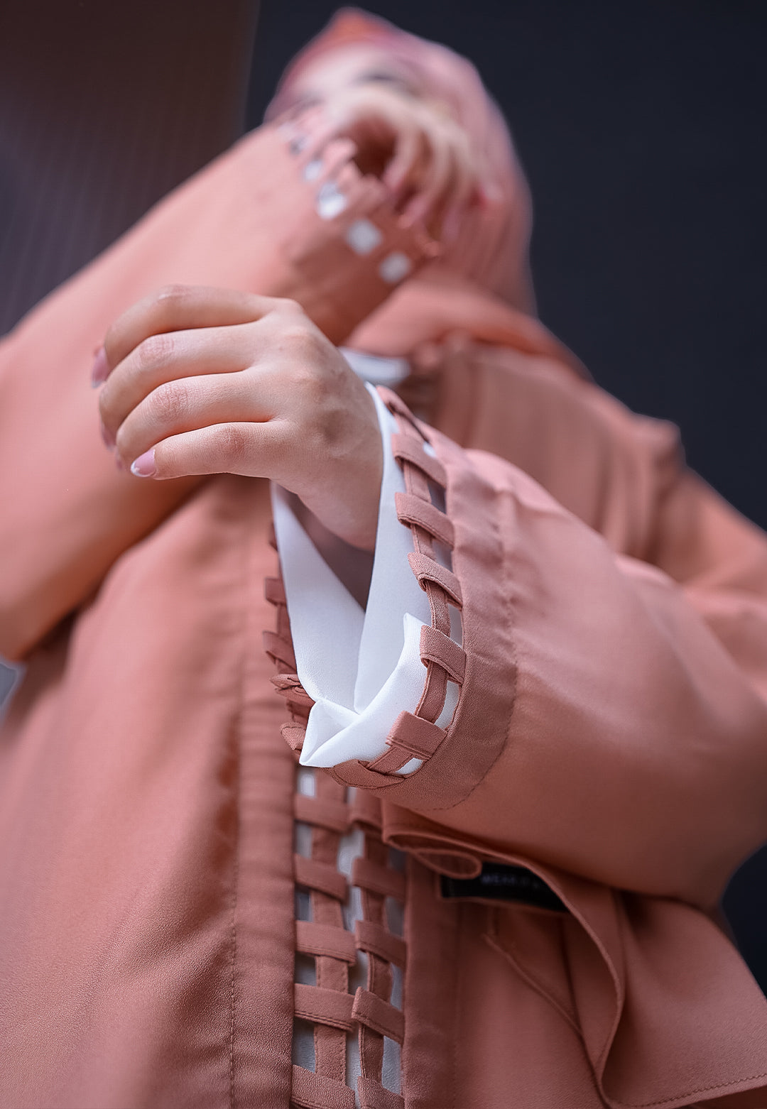 The dusty rose sleeve ends with the signature lattice ladder cuts.
