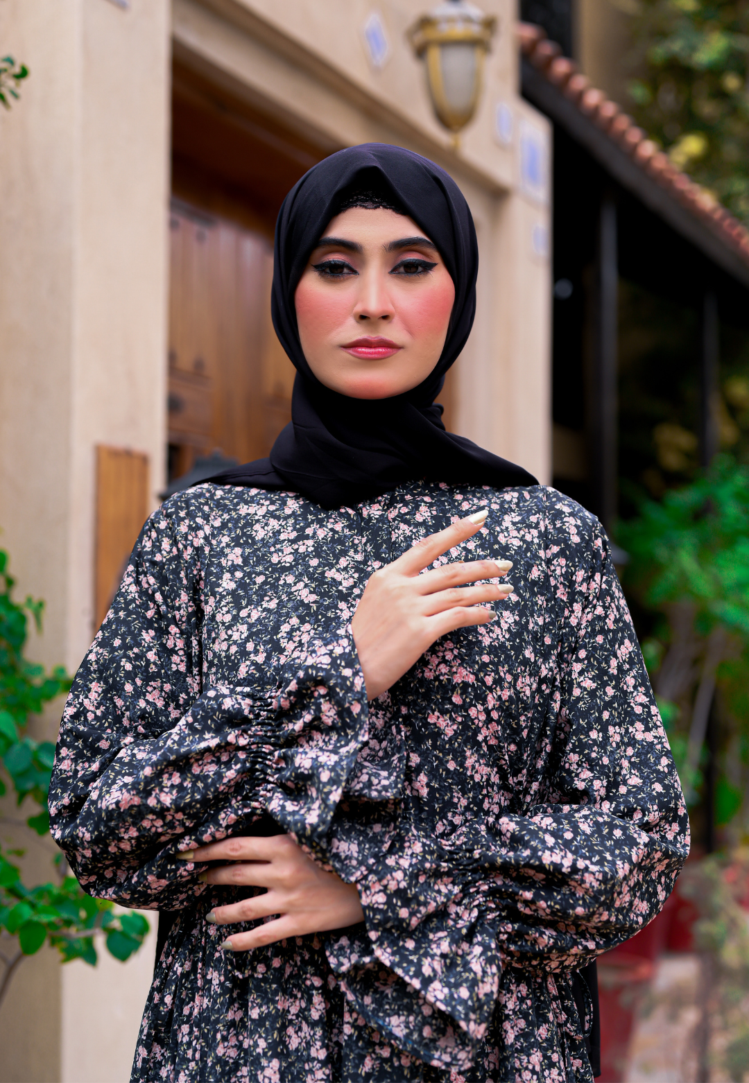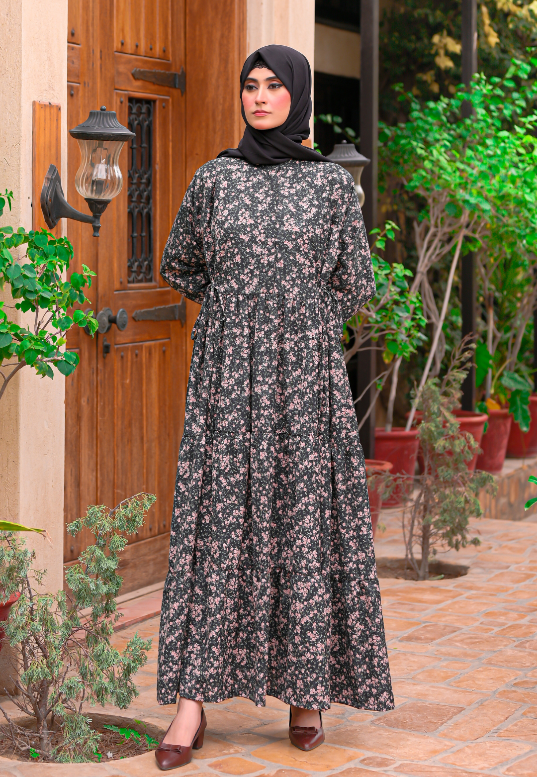 A timeless Floral Printed Abaya designed with a flared silhouette, accentuated by bodice gathers for a relaxed fit. Tailored with smokey sleeves and a sherwani collar, the front is open, offering both elegance and comfort. Includes abaya only.