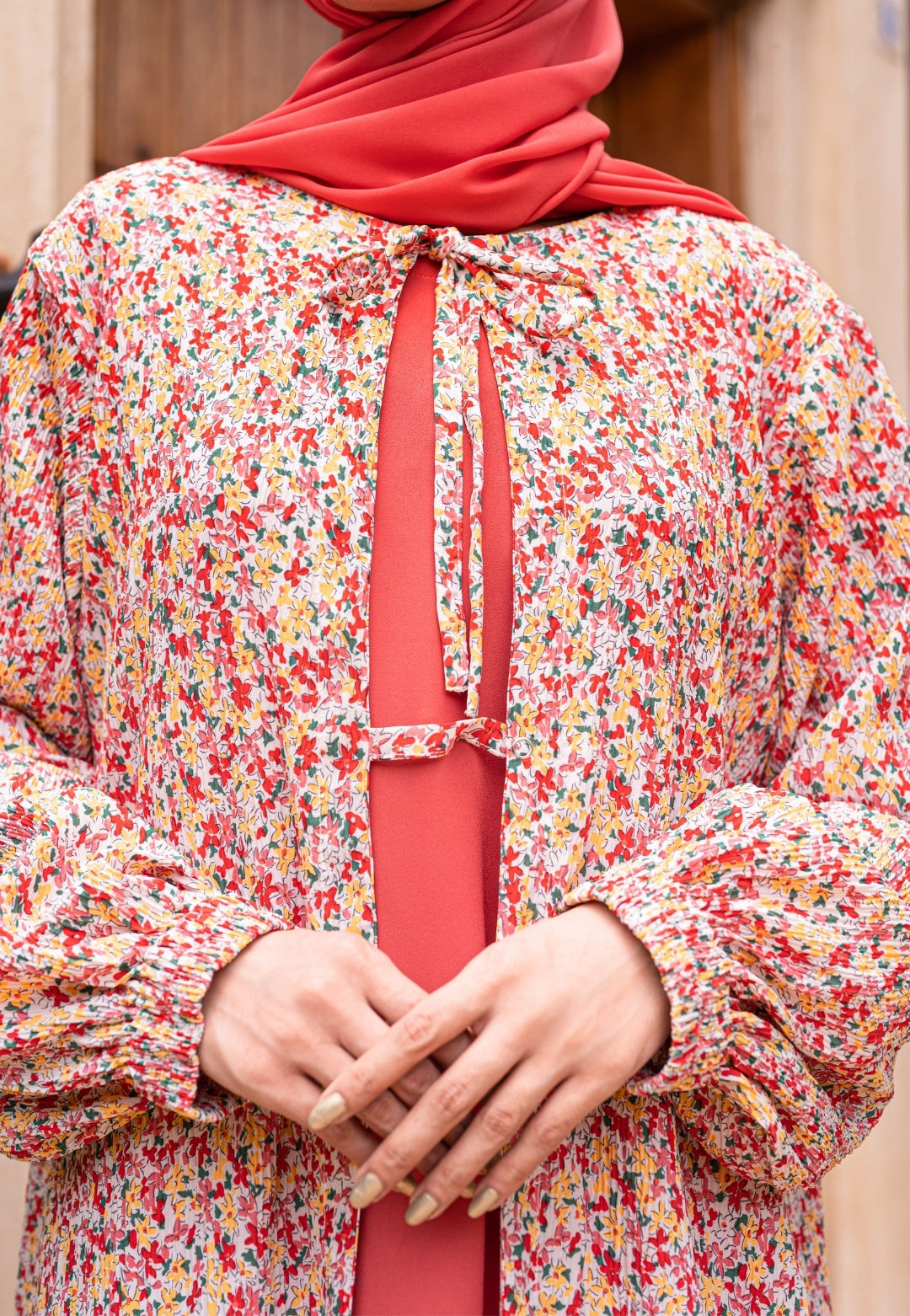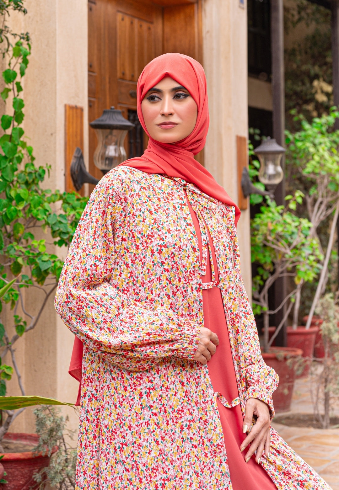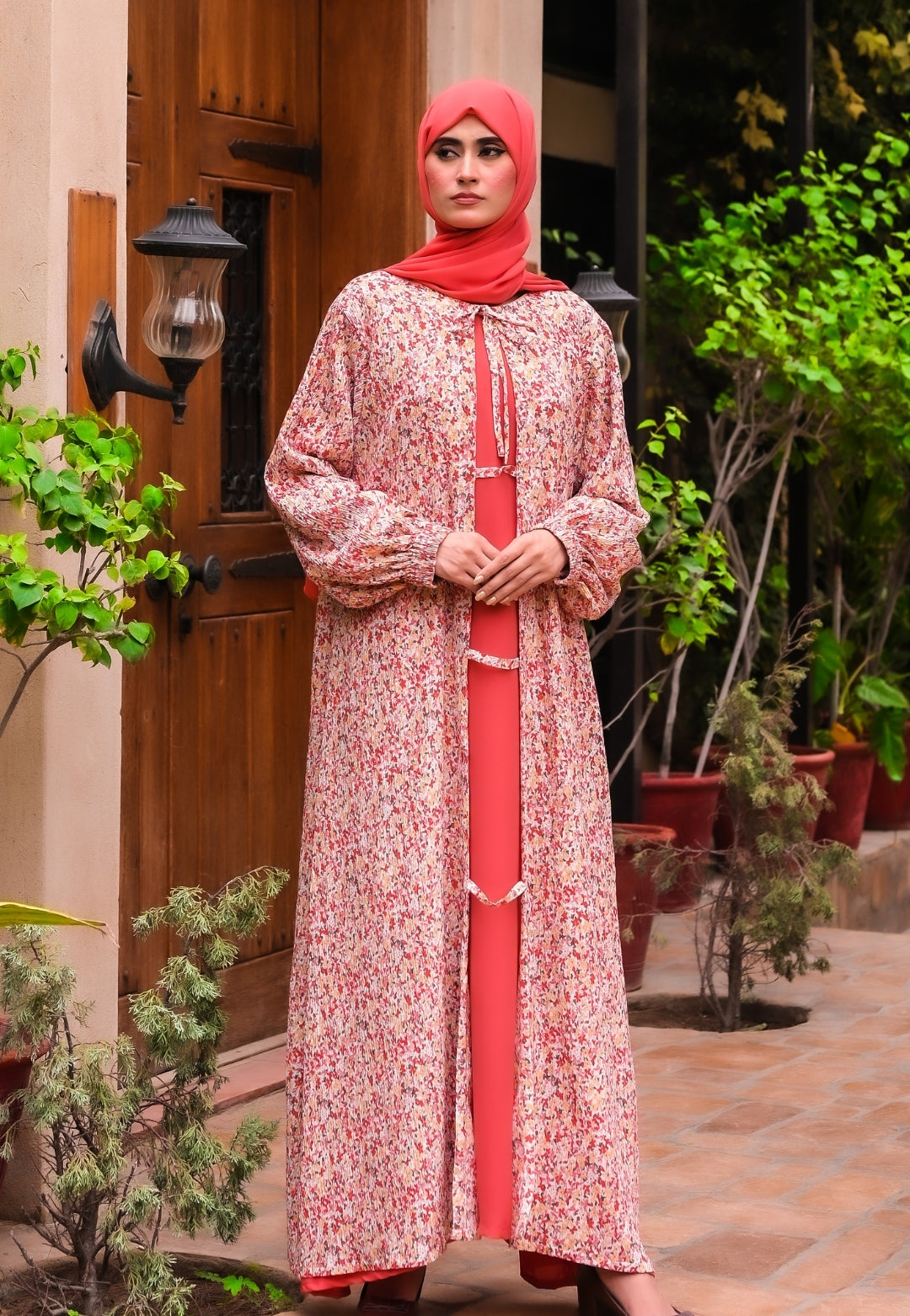 A timeless Floral Printed Abaya designed with a flared silhouette, accentuated by bodice gathers for a relaxed fit. Tailored with draped sleeves and a crew neckline, this abaya offers both elegance and comfort.