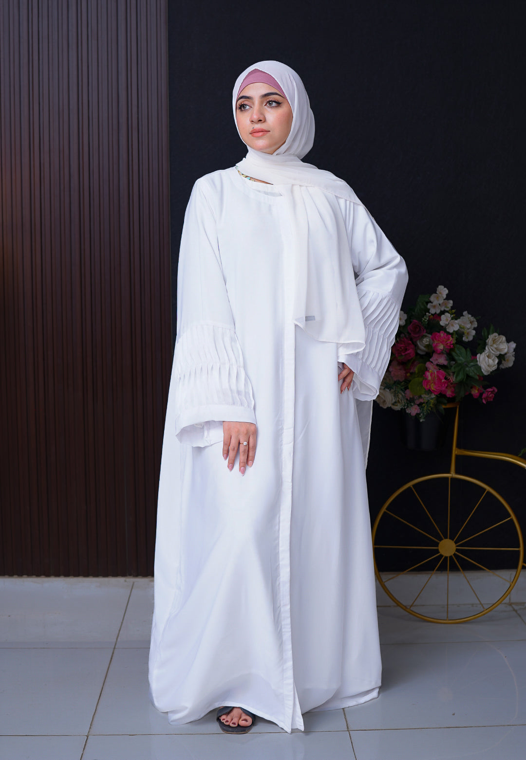 Elevate your modest wardrobe with a masterpiece of minimalist design. The Serene White Open Abaya strikes the perfect balance between serene simplicity and architectural detail. Crafted for the woman who commands attention through subtlety, this open-front piece features signature accordion-pleated sleeves that add a high-fashion, structural dimension to a classic silhouette.